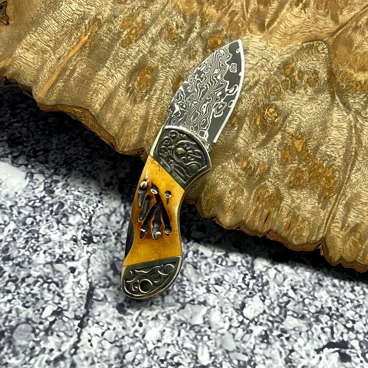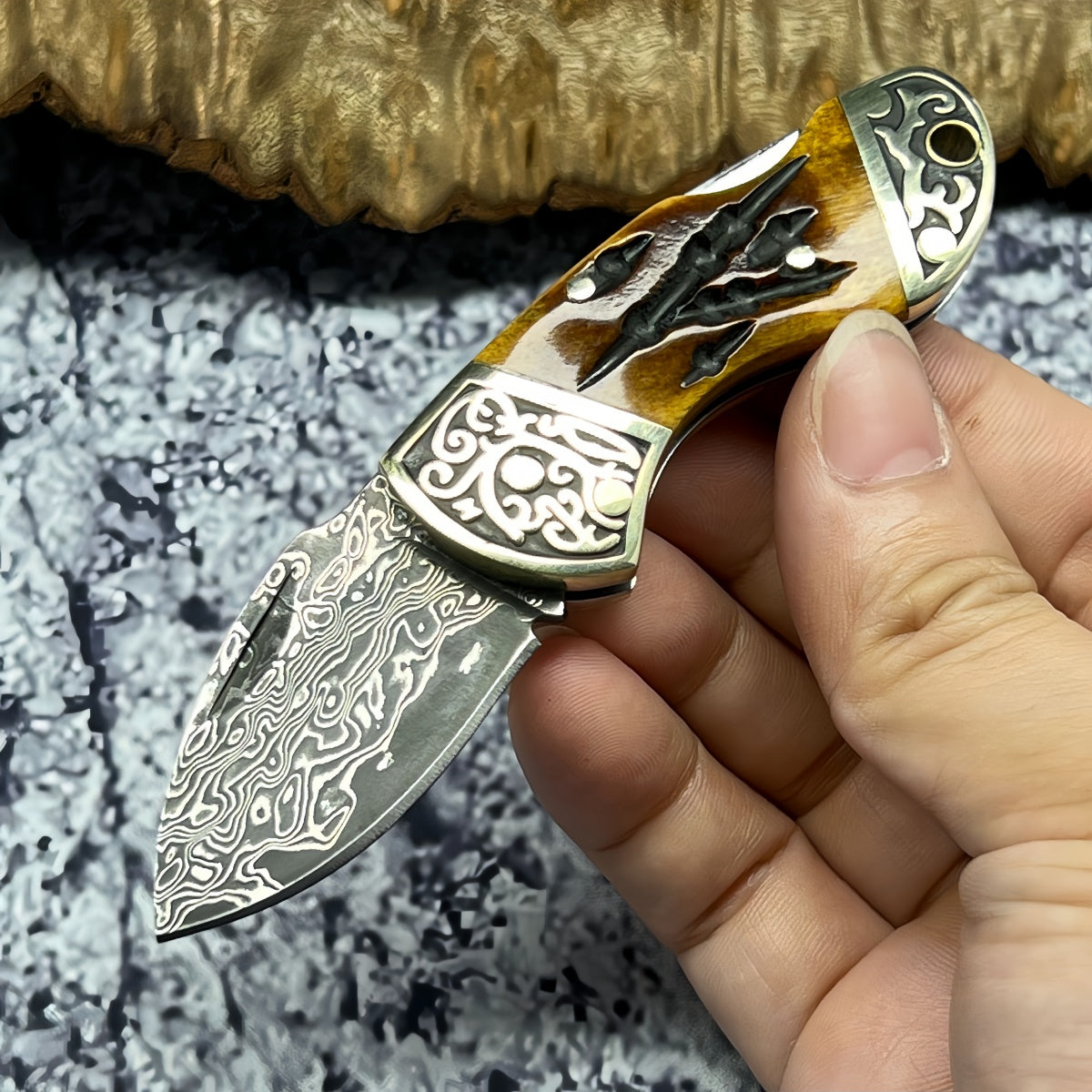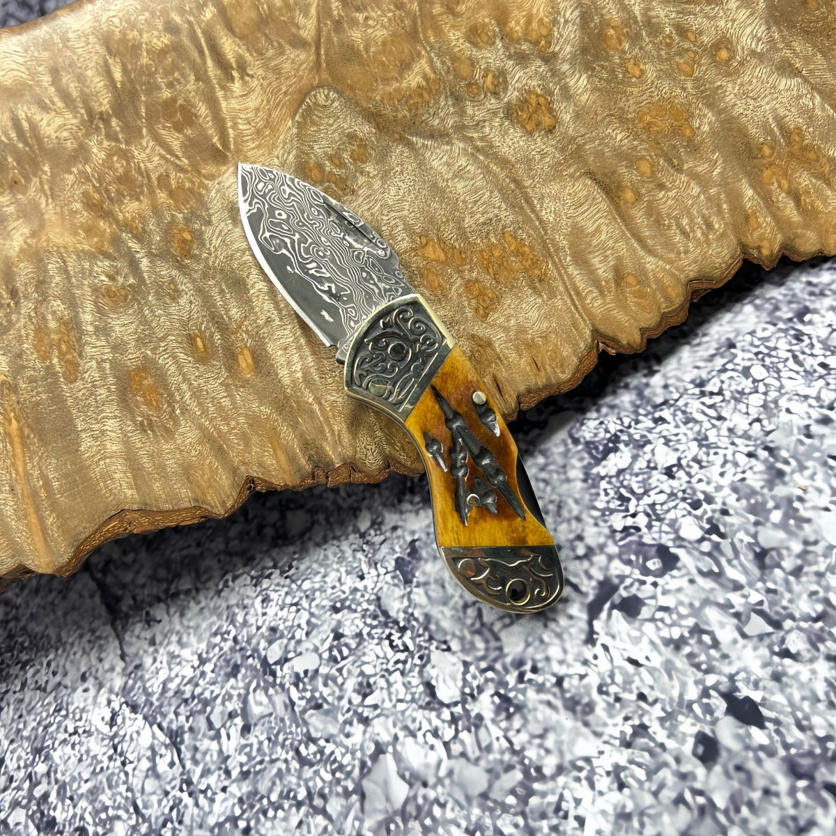 Rare Blade Material: The blade is forged from Damascus steel, offering exceptional sharpness and wear resistance. Its distinctive grain pattern is truly one-of-a-kind, ensuring each knife is a unique masterpiece.